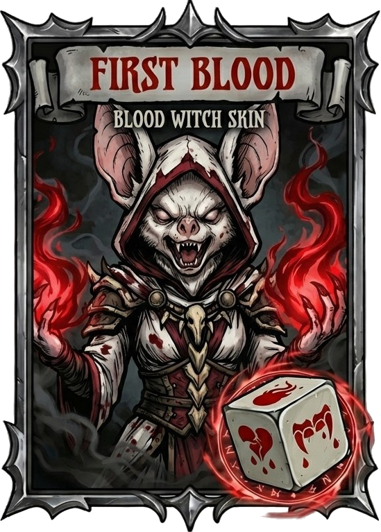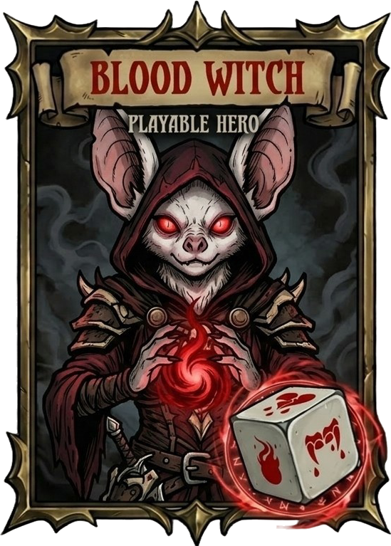 Blood Witch arrives with her own die, a unique pool of abilities, and a playstyle built around turning pain into power. Rather than relying on mana, she fights through sacrifice: wounding herself, draining life, and converting danger into burst damage, sustain, and ritual control.